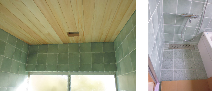 旦那様:おふろ!森の中にいるみたいで、とっても気持ちいい(浴槽を据えたら、ご主人が、工事中にもかかわらず浴槽内に入って「早く入りたいな~楽しみだな~」とウキウキしてました)