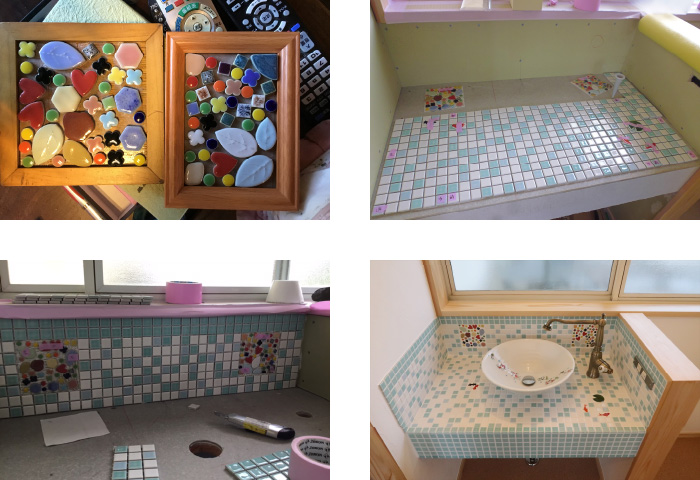 奥様:洗面台です。孫と並べたいろいろな柄のモザイクタイルをはめ込んでもらいました。どうしたら、並べた通りに張ってもらえるかタイルやんにもアドバイスをもらい、はめ込む位置、タイルの配色も現場で打合せしました。洗面器は益子に行き、お気に入りのボールを見つけてきました。その時に買った小さな金魚のタイルも、洗面器に合わせてはめ込んでもらいました。